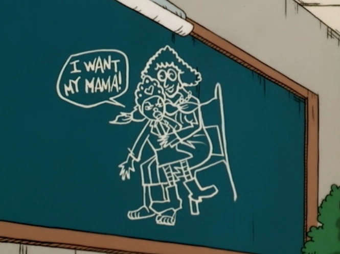 After a while, the gang visits Miss Grotke's classroom and sees a drawing on the chalkboard the kids were laughing at. Spinelli dislikes the drawing and frustrates herself with revenge to the students that have mocked her before. She walks through the desks and exclaims "I've had it ya punks! I'm gonna cream every last one of ya!". Shortly after, Miss Grotke walks in and softly demands her to sit down. She sees the drawing and erases it as she also dislikes it as well. Even though she refuses to tolerate bullies, she decides to inform students about neglect and cruelty in a peaceful way to express how it is like to be in this situation. T.J. raises his hand and has a final solution to expose; all he does is to call the teacher "mama". Spinelli thinks this is crazy, but T.J. says that it is the only way. The solution leads to the rest of the students calling the teacher "mama" in expressive ways, making both Miss Grotke and Spinelli happy about it.